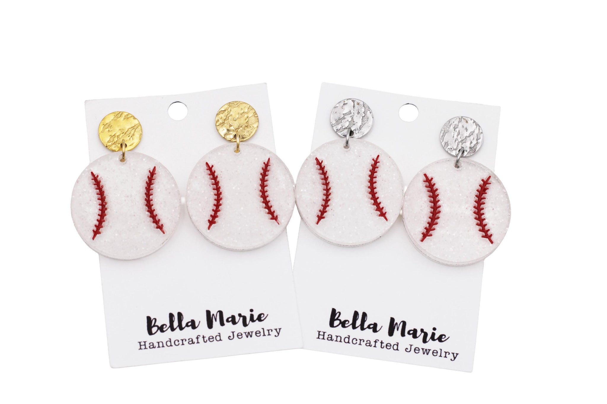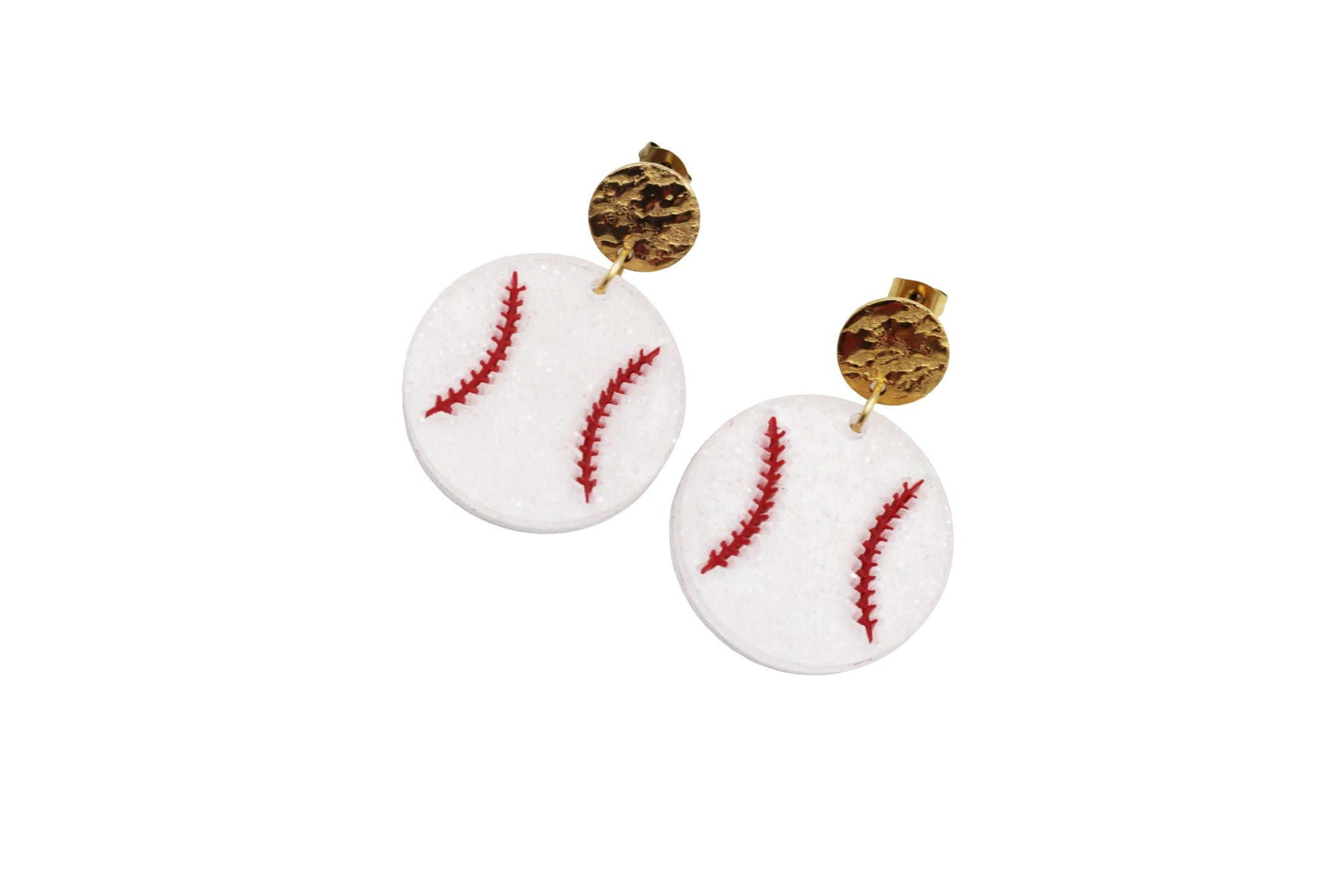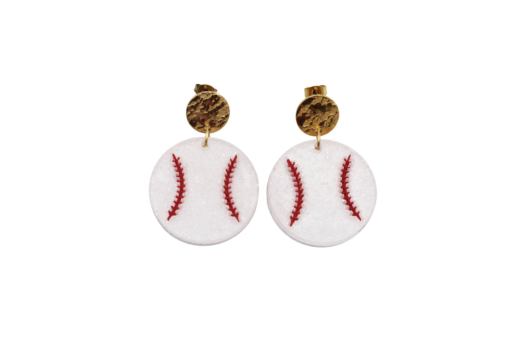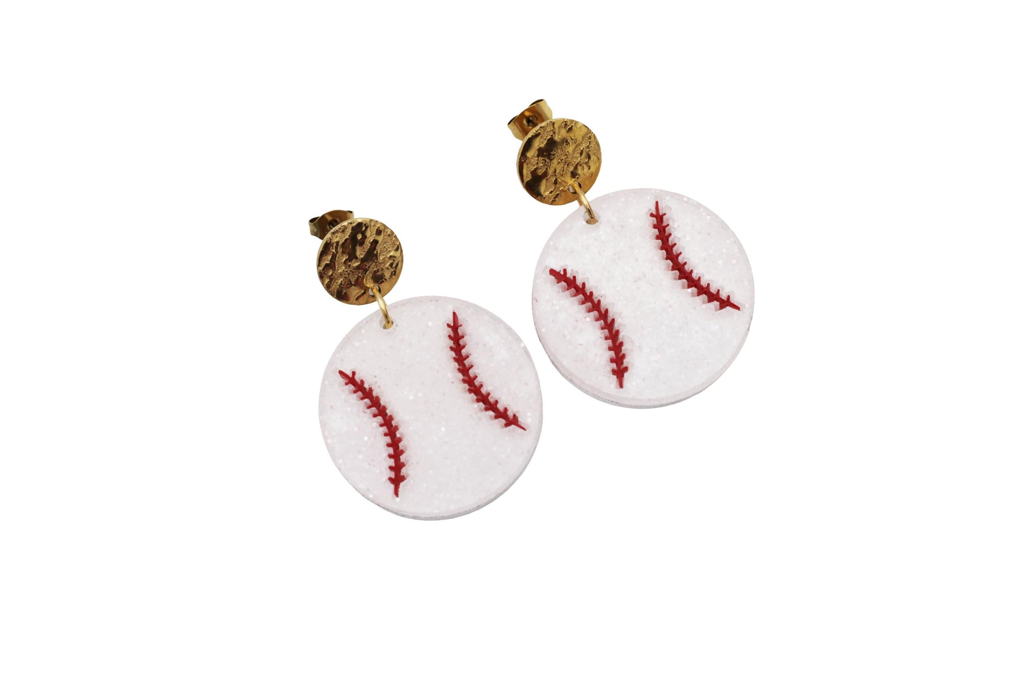 Show your love for the game with these fun baseball statement earrings. Designed to look like classic baseballs with red stitched detail and subtle glitter, these earrings are the perfect accessory for cheering on your favorite player from the stands or celebrating baseball season in style.