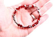 A red and silver beaded bracelet is the perfect accessory to top off your look. This non-stretch bracelet features two-tone red and silver with smaller silver glass beads hand-strung onto flexible jewelry wire. The bracelet is finished off with a lobster clasp, and a 1" extender chain to accommodate various wrist sizes.