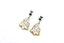 They feature hand-assembled Christmas tree cookie acrylic charms with hand-painted detailing. Each earring is finished off with a stainless steel ear post.