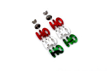 Each earring features red, white, and green marbled acrylic laser cut into the words "ho ho ho". Each earring is finished off with a stainless steel post.