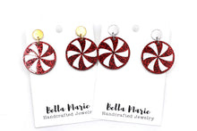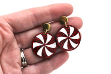 These dangle-style earrings feature red glitter peppermint candy-shaped charms with hand-painted engraved detailing. Each earring is finished off with a stainless steel ear posts.