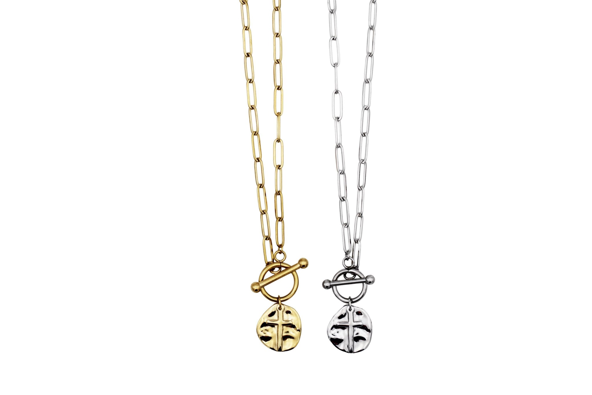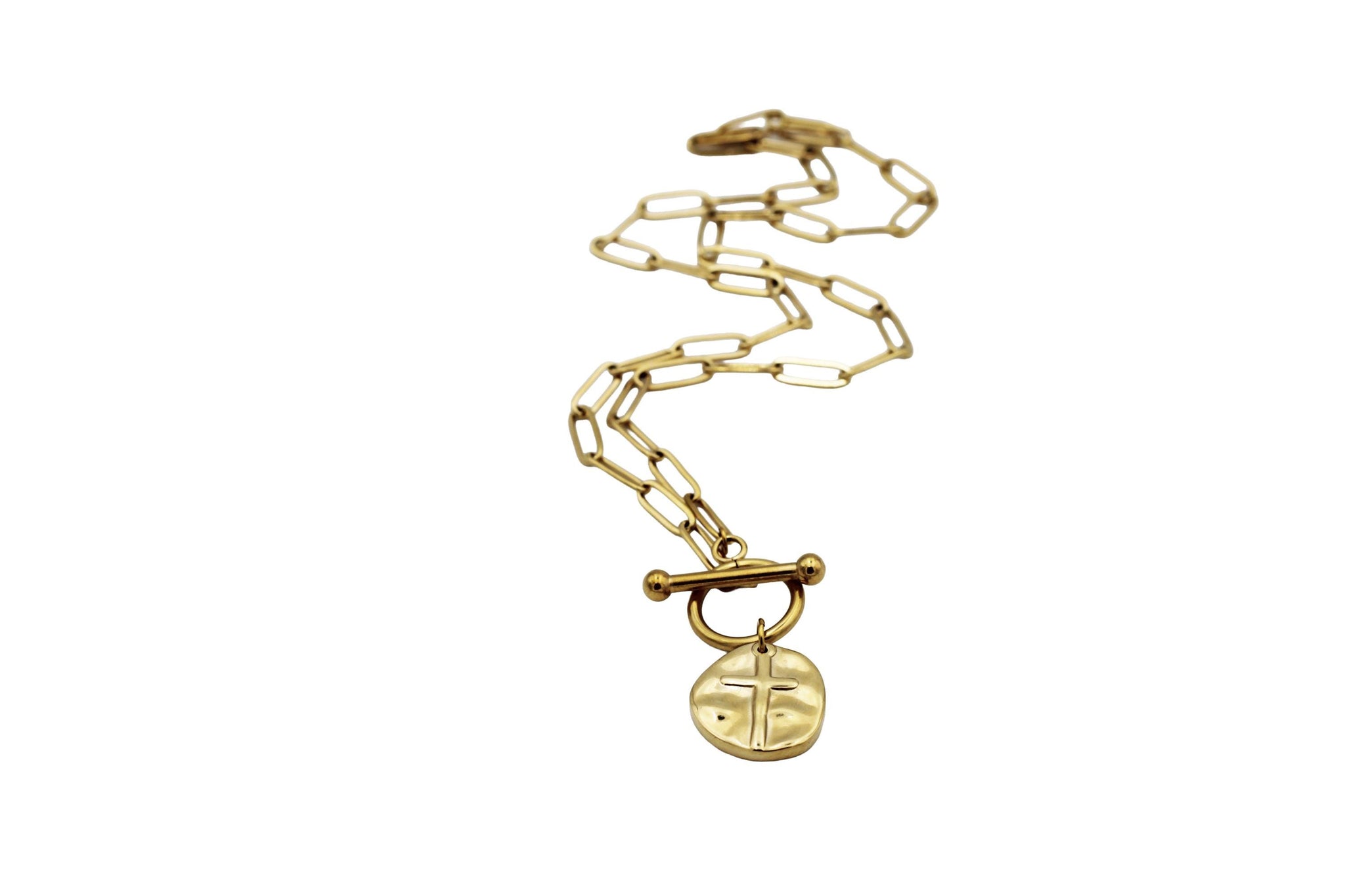 This toggle cross necklace blends modern simplicity with meaningful design. Featuring a paperclip chain and a textured round medallion with a cross, this piece is both faith-inspired and effortlessly stylish. Finished with a chic toggle clasp that sits front and center, it’s perfect for everyday wear or layering with your favorite chains.