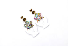 These cute earrings feature white acrylic cut into bunny ears paired with a multicolored fleck glitter flower. Each earring is finished off with a stainless steel ear post.