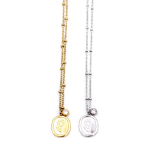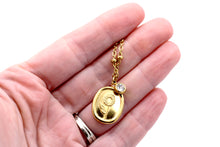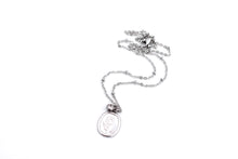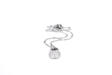 This minimalist style necklace features a wax stamp-style charm imprinted with a flower paired with a small rhinestone charm with a clear rhinestone. Both charms hang from a stainless steel chain. The entire necklace is finished off with a lobster clasp.