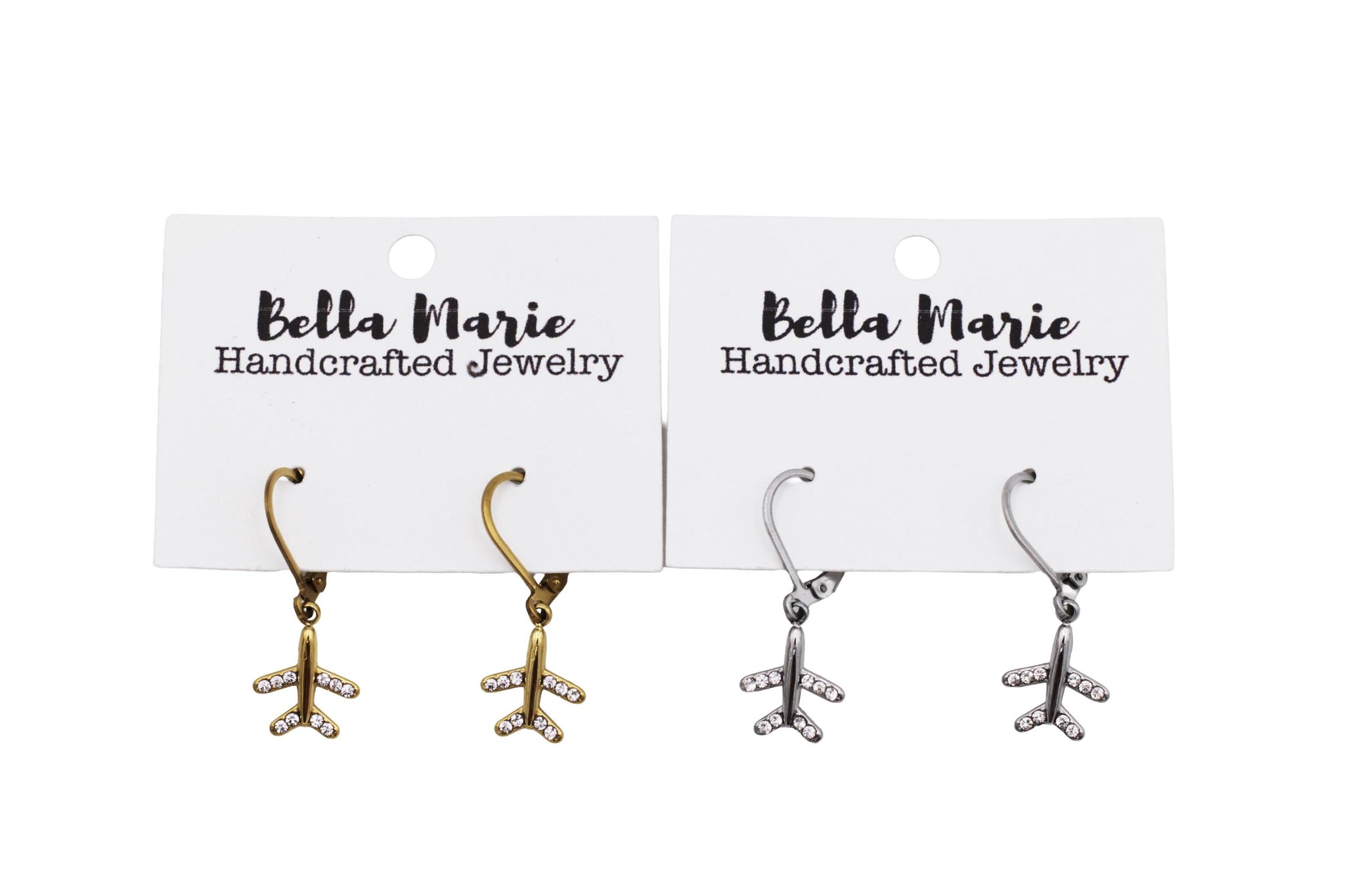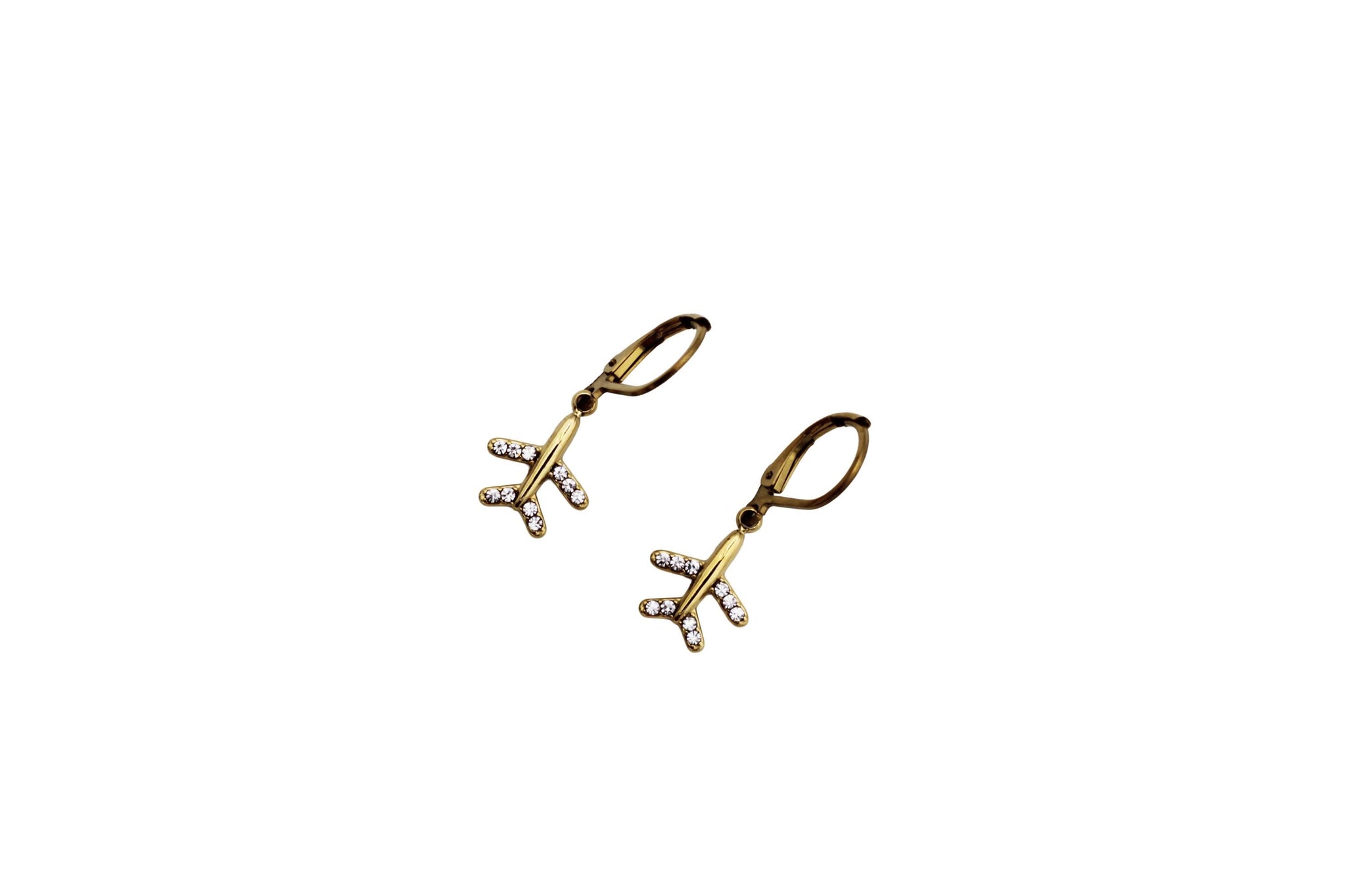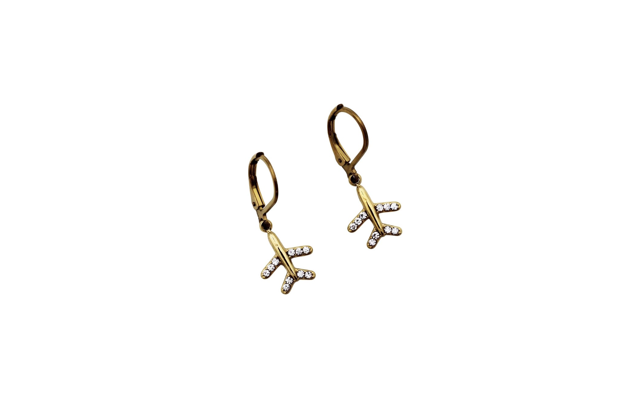 Celebrate your love of travel with these airplane dangle earrings, featuring a sparkling rhinestone airplane charm that adds just the right touch of shine. Available in gold or silver, these earrings are lightweight, easy to wear, and perfect for everyday adventures—or dreaming about the next one.