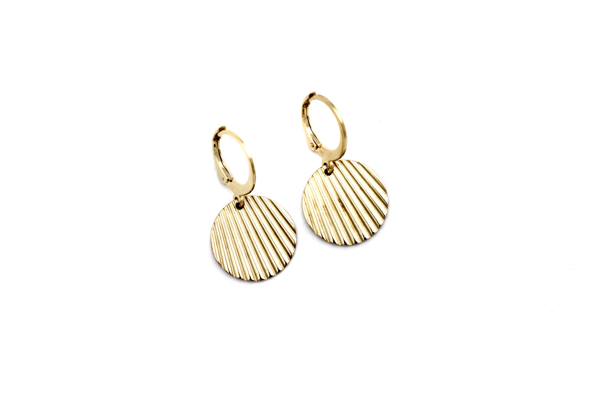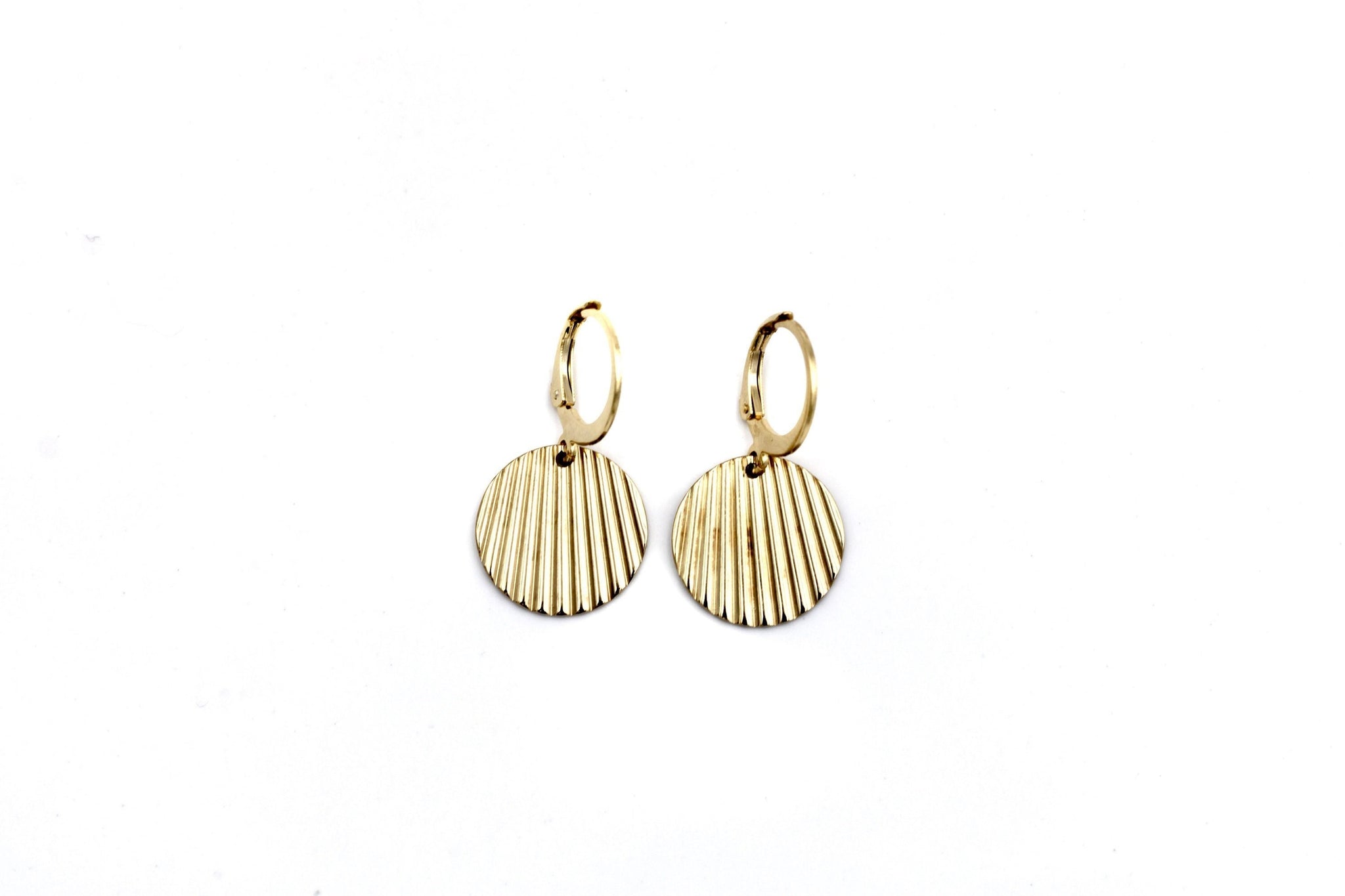 These lever earrings are so lightweight they will become a staple in your wardrobe. They are also perfect for any occasion and can easily be dressed up or down. These lovely earrings feature ridged metal textured stainless steel round charms and are finished off with a stainless steel lever-style hoop.