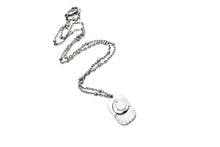 This celestial-inspired necklace features a stainless steel crescent moon tag-style charm. The necklace is finished off with a stainless steel chain and a lobster clasp.