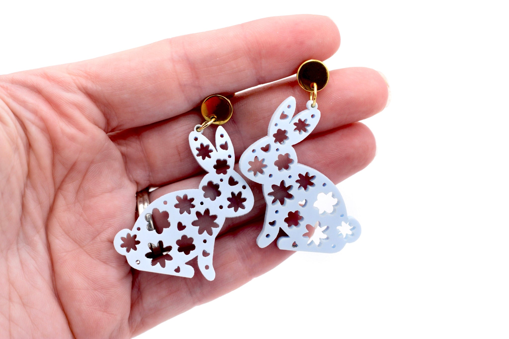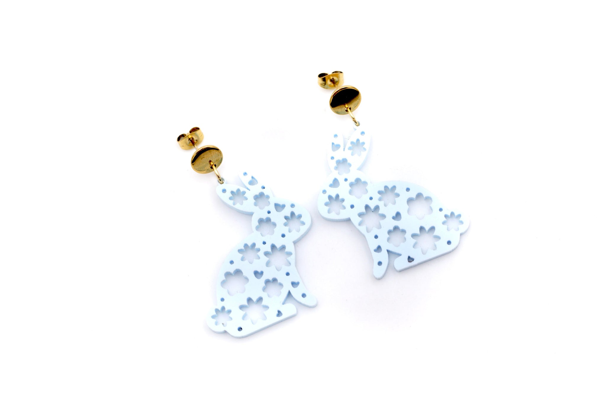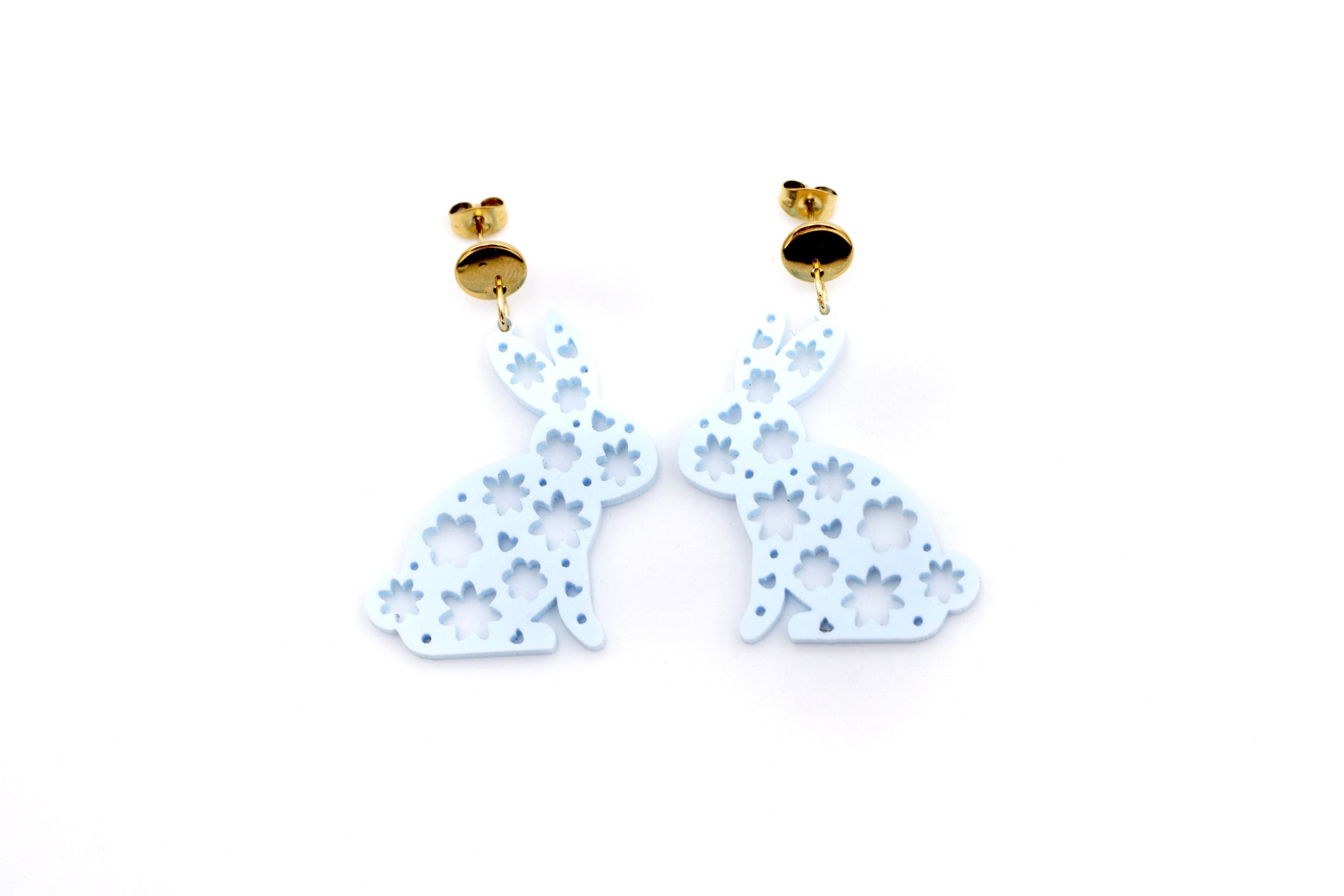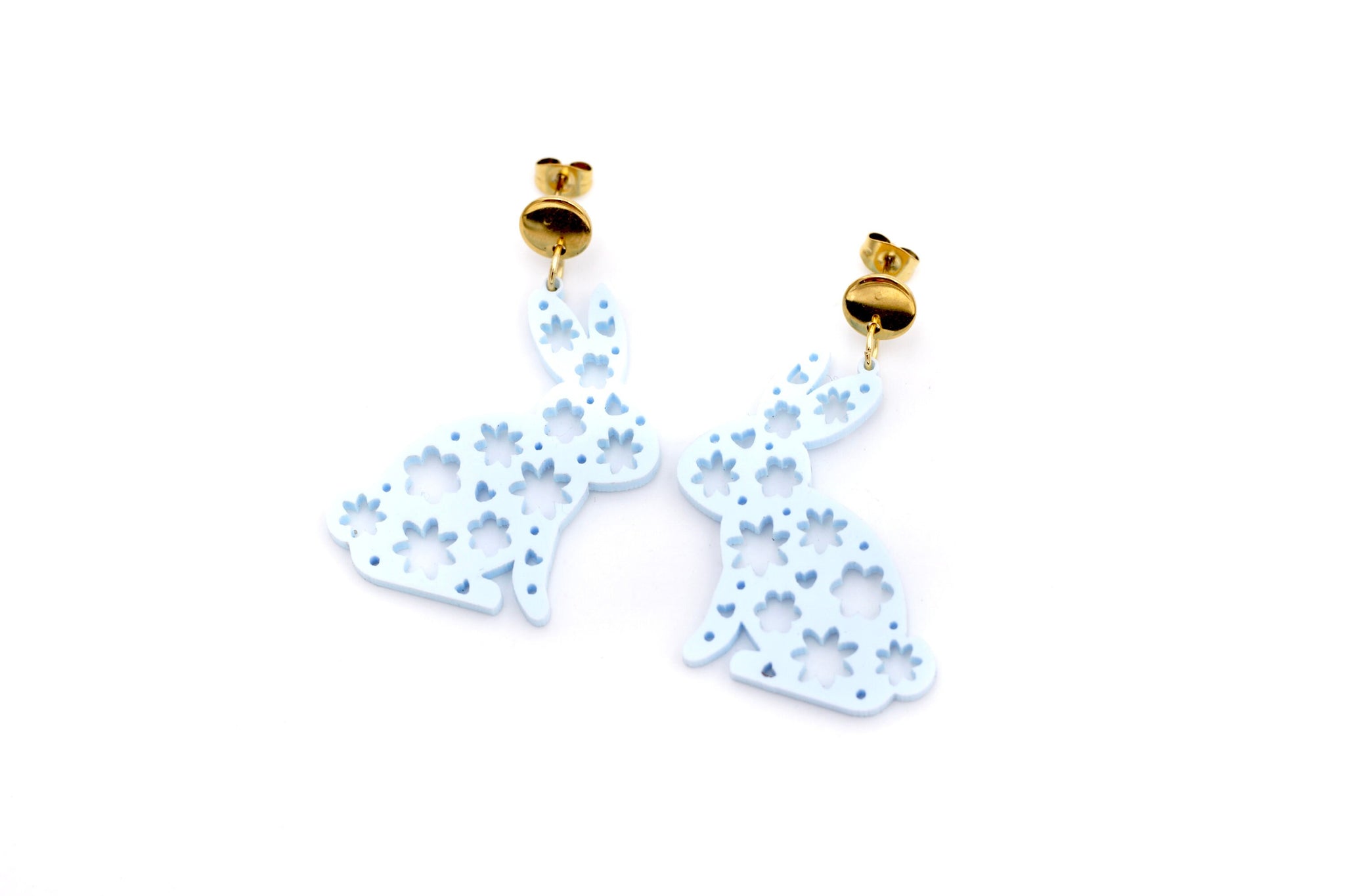 These dangle-style earrings feature light blue acrylic cut into the shape of cute floral patterned bunnies. Each earring is finished off with a stainless steel ear post.