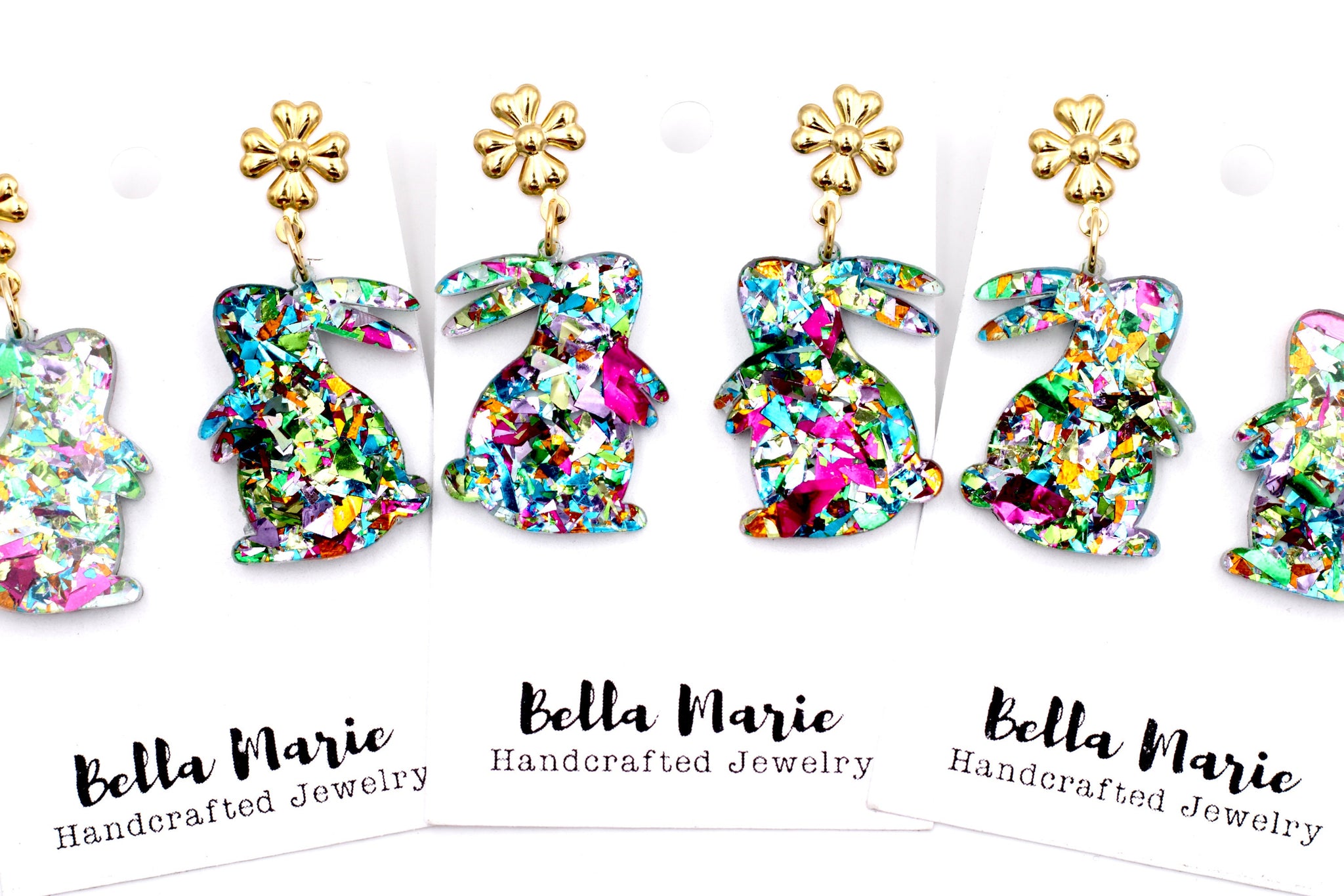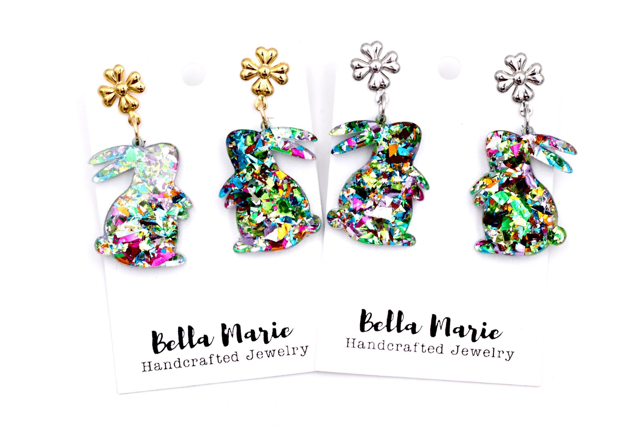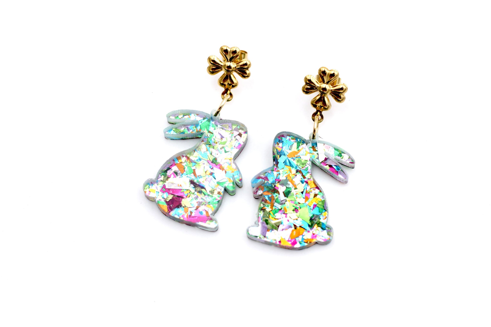 These dangle-style earrings feature multicolor glitter fleck acrylic cut into the shape of cute little bunnies. Each earring is finished off with a stainless steel ear flower post.