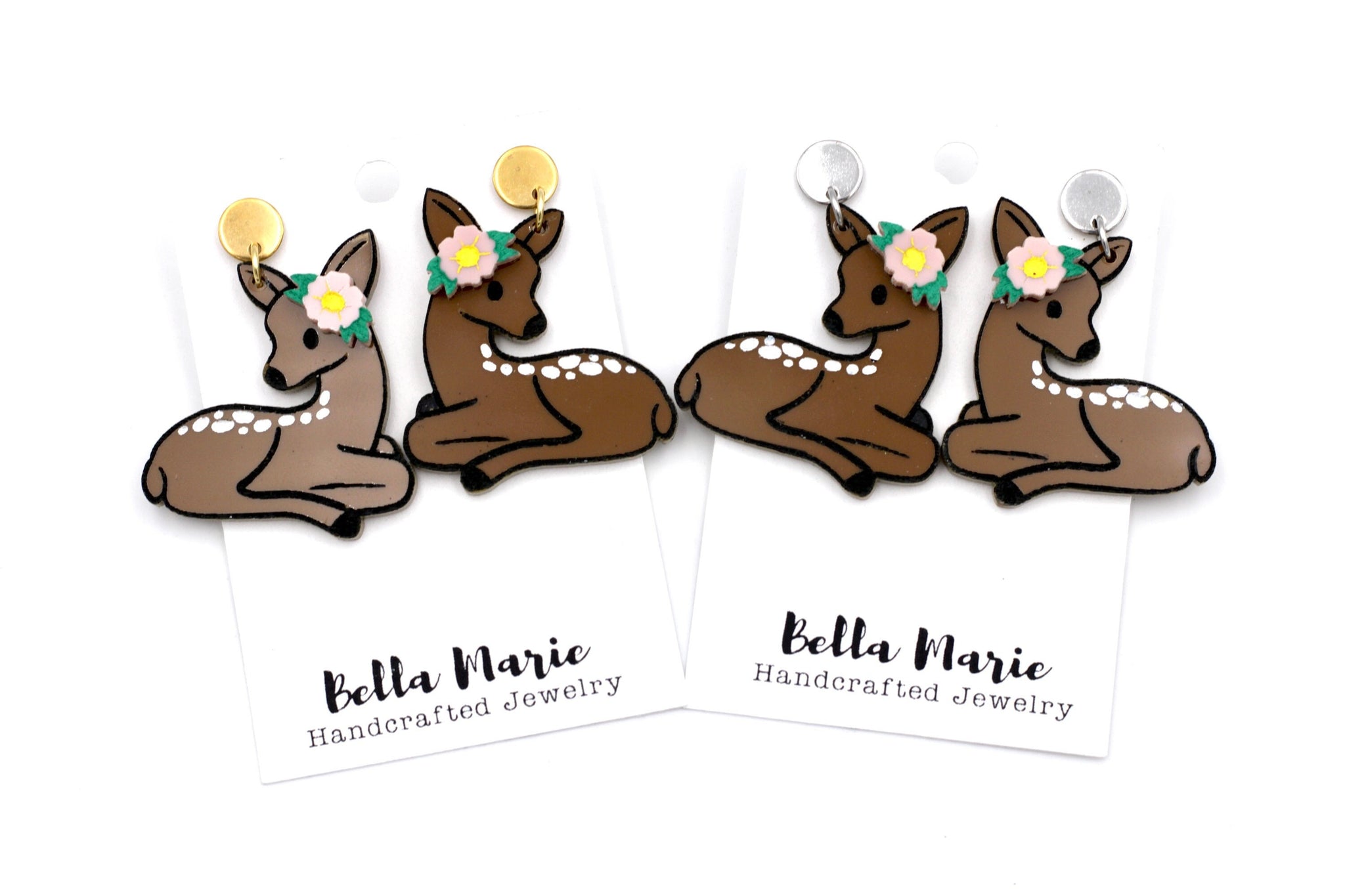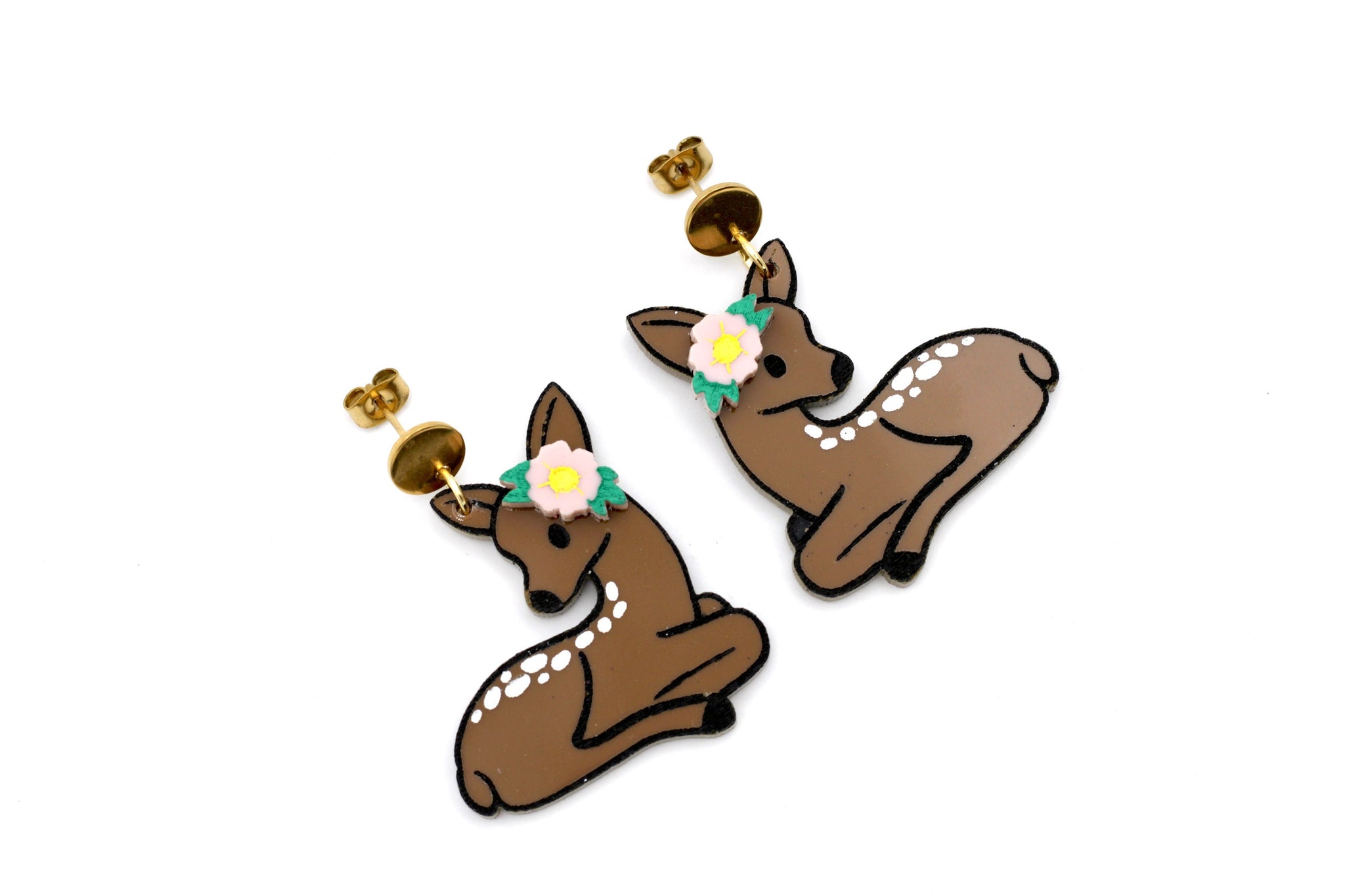 These cute acrylic earrings feature a brown baby deer with hand painted details paired with a pretty little pink flower. Each earring is finished off with a stainless steel ear post.
