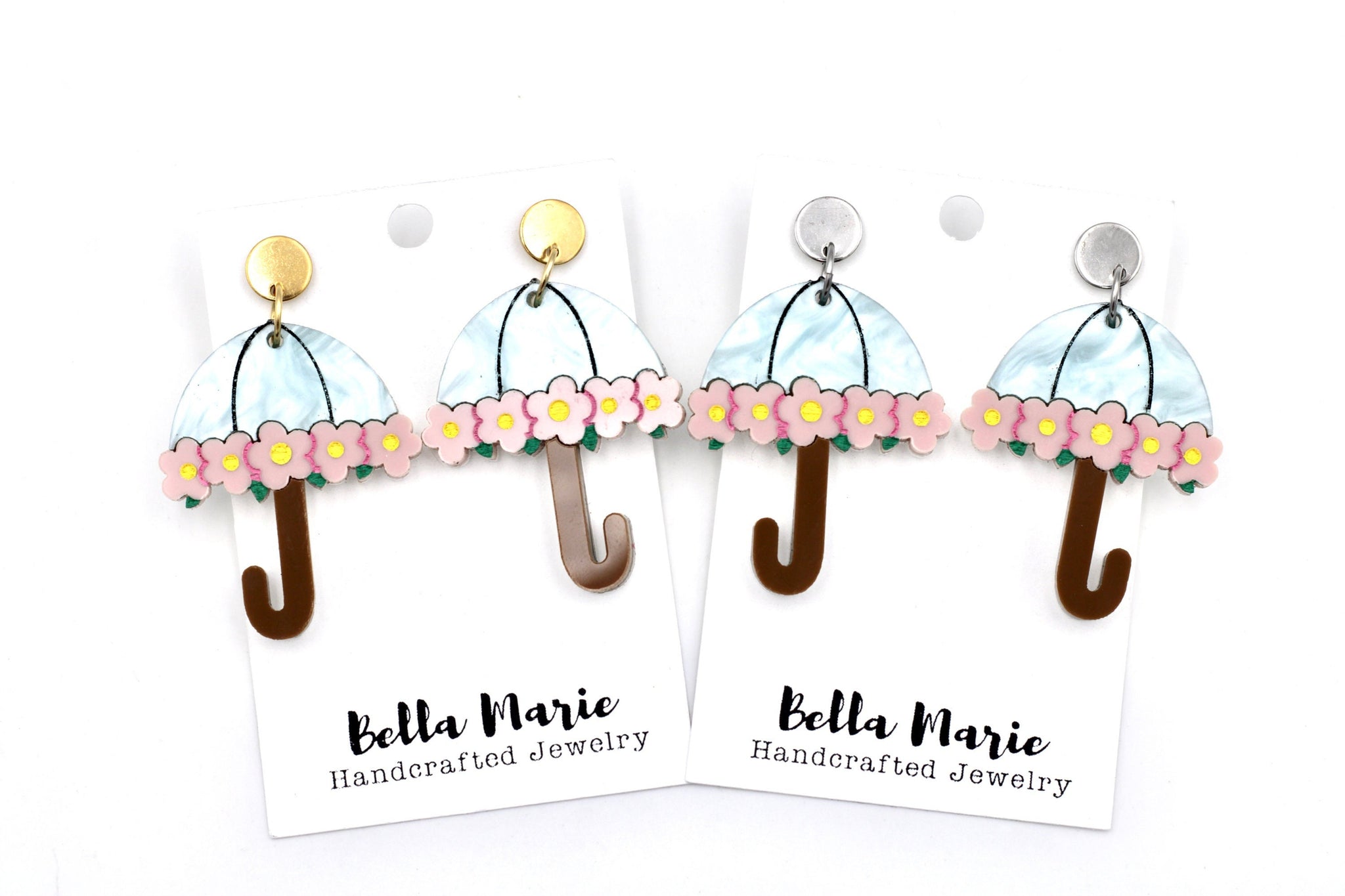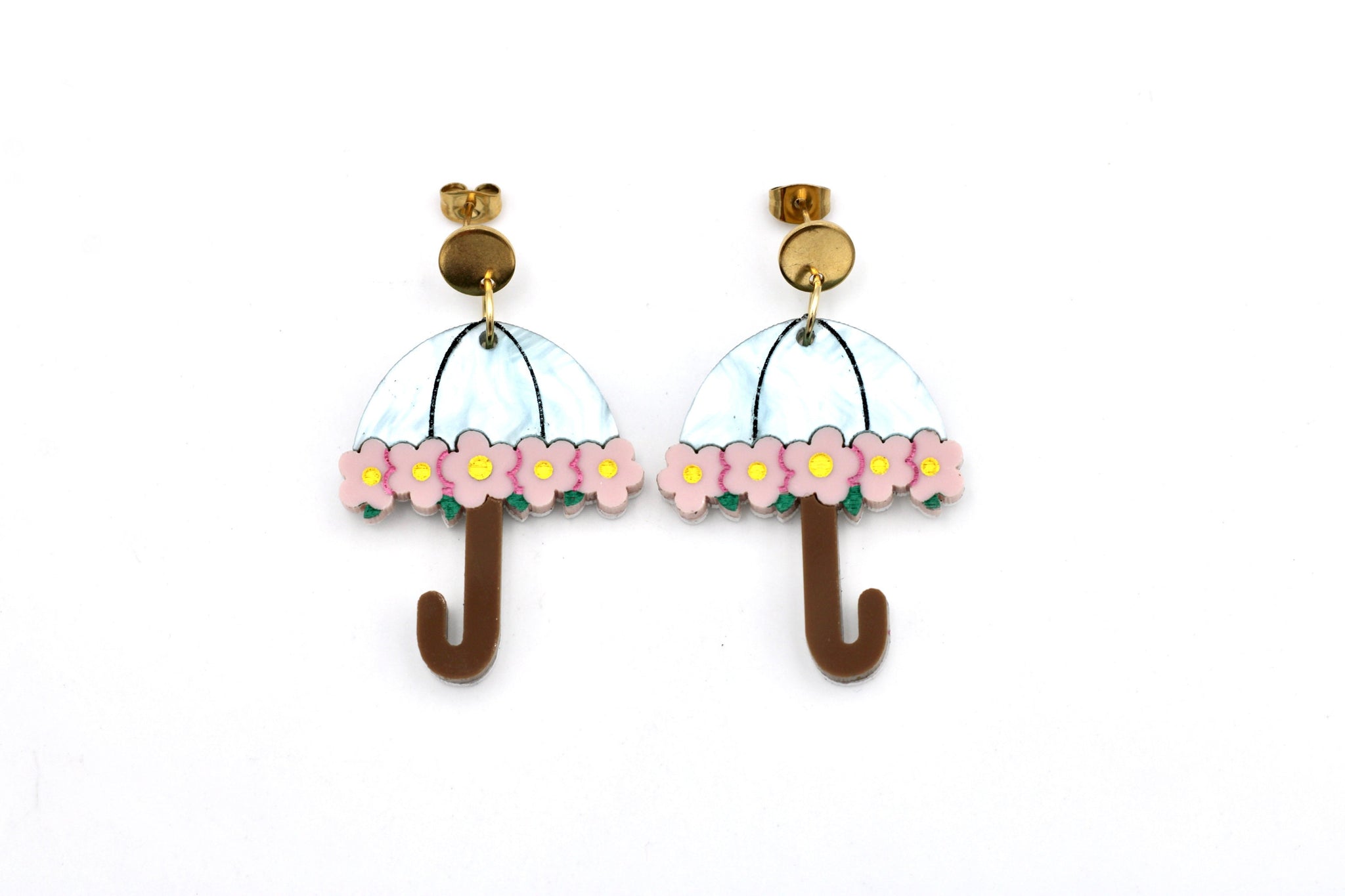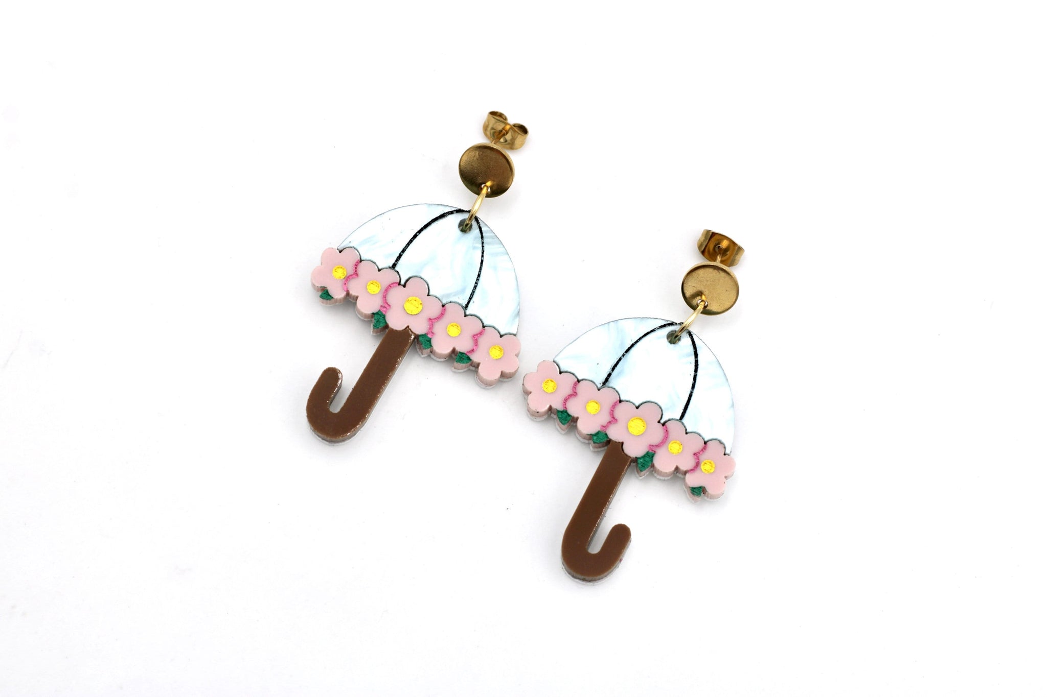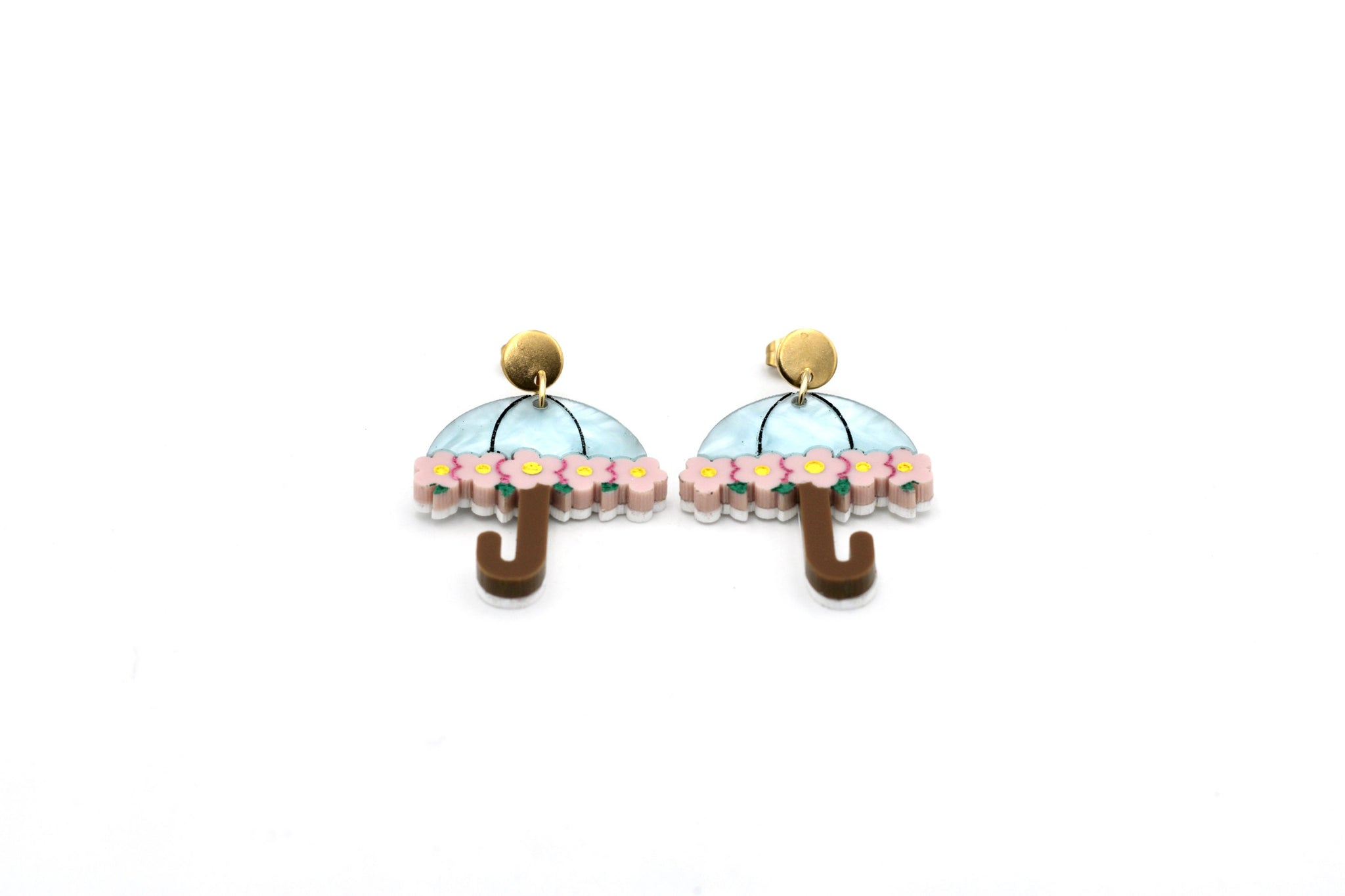 These cute acrylic earrings feature an umbrella with hand painted details, hand pieced together with pretty little pink flowers. Each earring is paired with a stainless steel ear post.