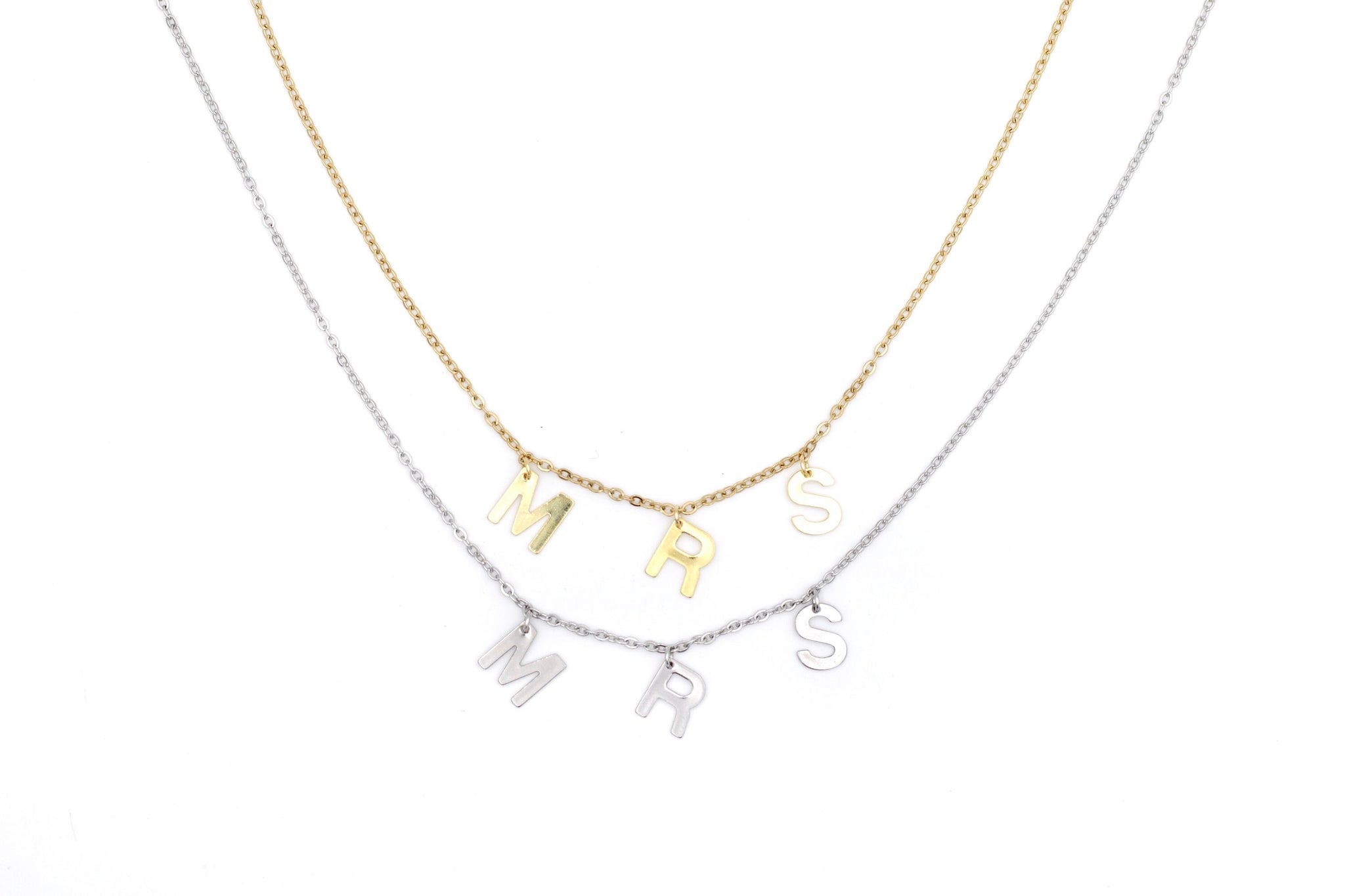 These necklaces feature stainless steel letter charms that spell out "Mrs". Each letter is individually placed by hand along a stainless steel chain. Each necklace is finished off with a lobster clasp.