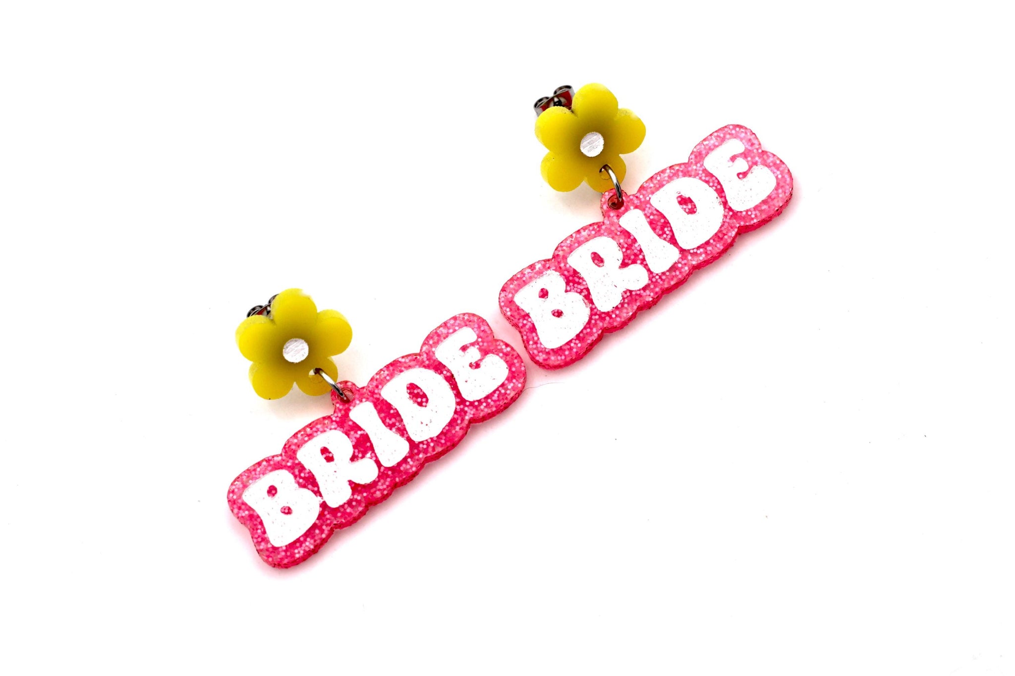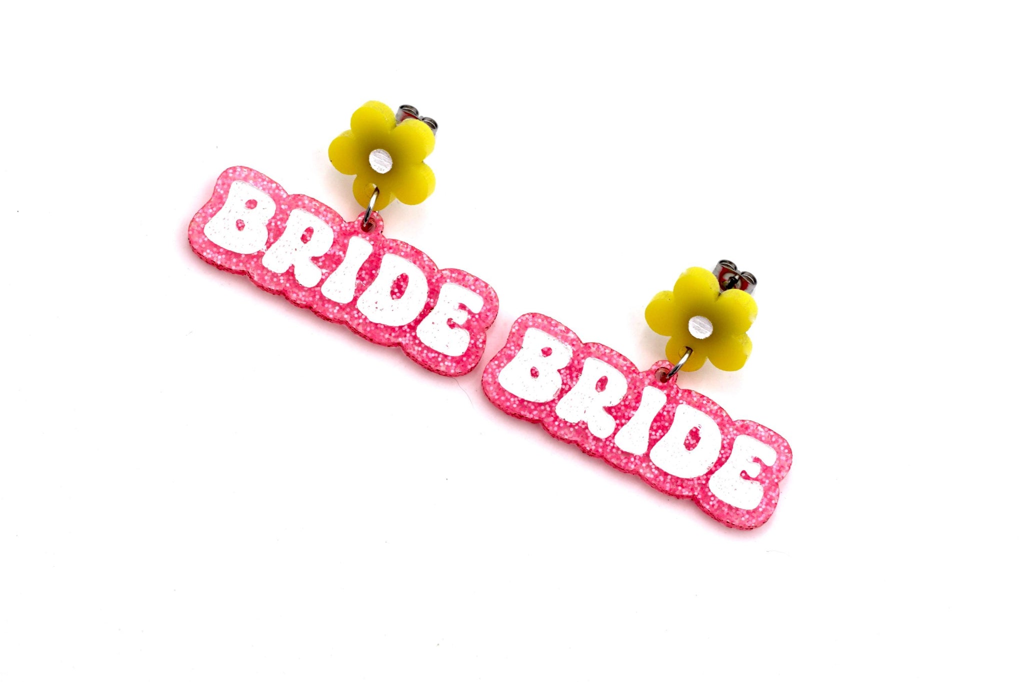 Celebrate love in bold, sparkly style with these fun Bride or Mrs statement earrings. Featuring bright pink glitter acrylic with white hand-painted lettering paired with cheerful yellow flower studs, these earrings are designed to stand out and make any bridal moment even more special.
