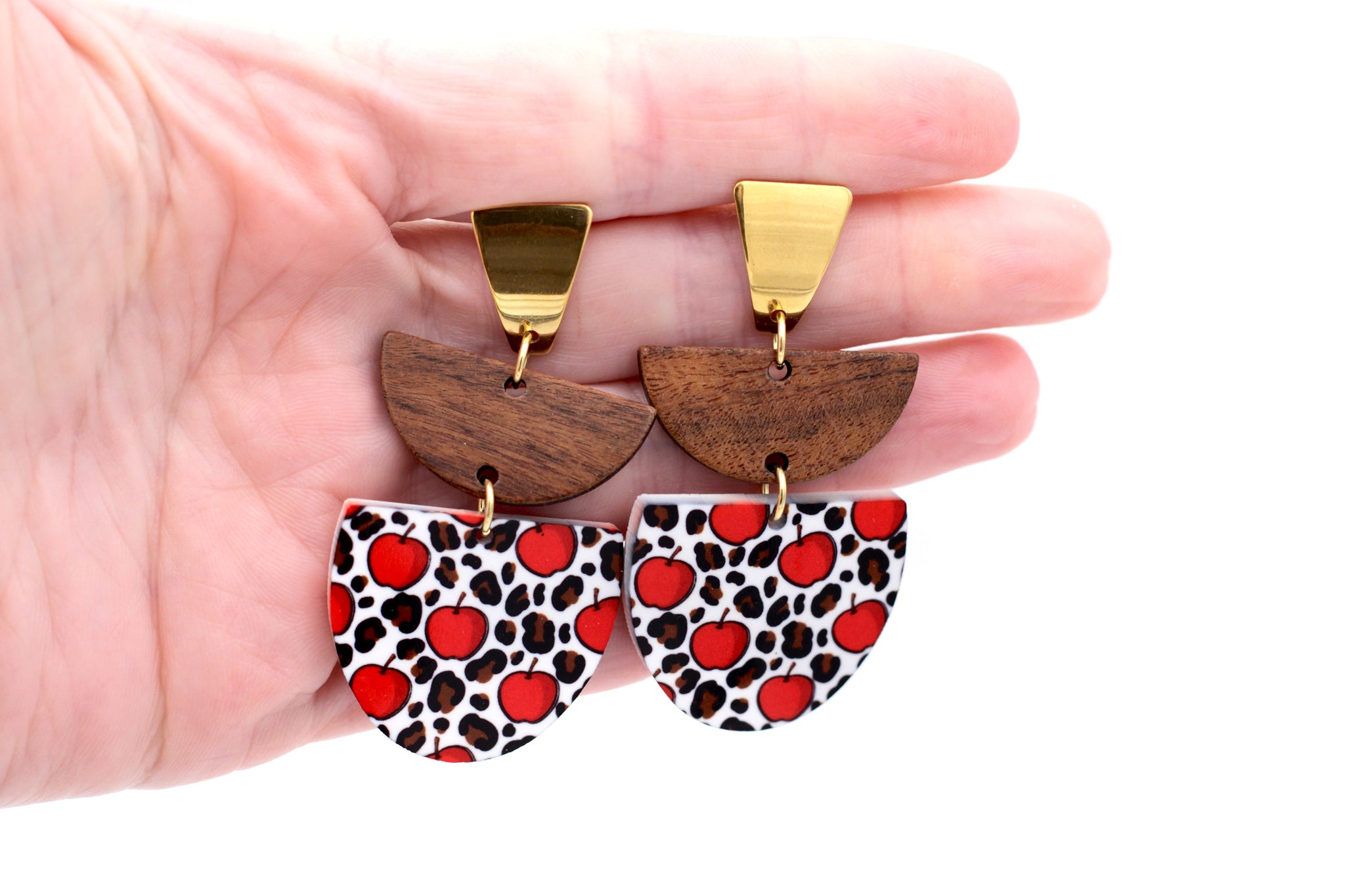 They feature a handmade apple and leopard patterned acrylic charm paired with a wood crescent link and gold stainless steel ear posts.